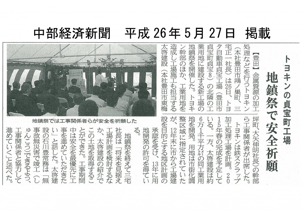 また、地鎮祭の様子が中部経済新聞に掲載されました。
