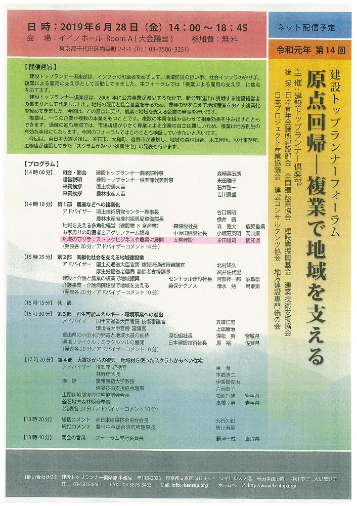 建設トップランナー倶楽部主催の「建設トップランナーフォーラム」において、「地域の守り手:ストックビジネスや農業に展開」と題して発表いたします。